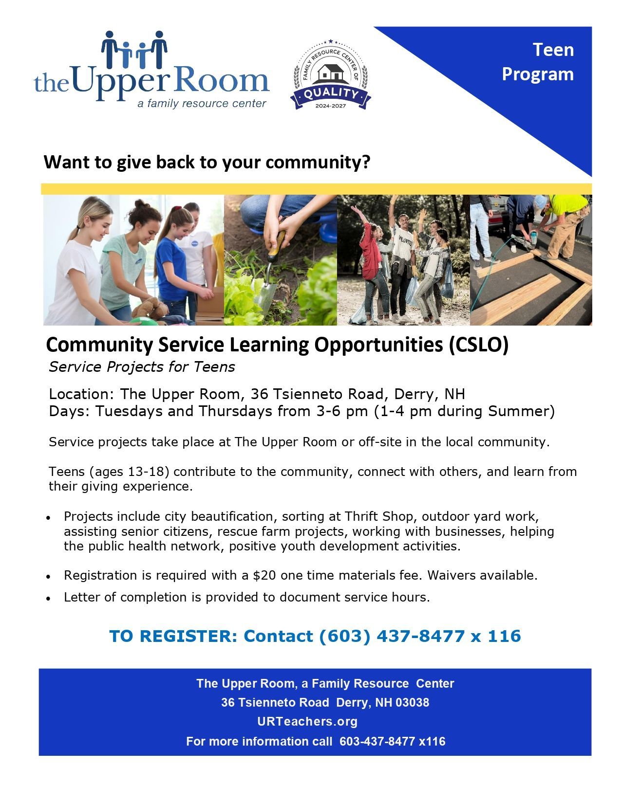 Supervised community service projects for youth ages 13-18.